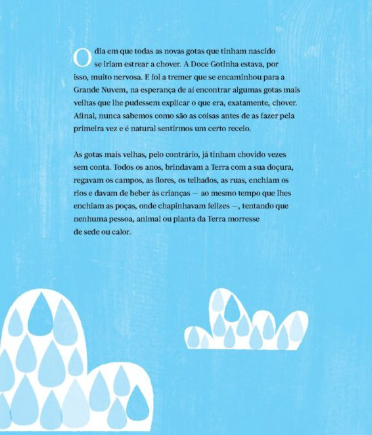 Esta é a história de uma pequena gota de água e das suas aventuras, desde o momento em que se prepara para cair pela primeira vez como chuva, até ao seu regresso à grande nuvem. A Doce Gotinha leva-nos numa viagem através de mares, rios e riachos; voamos do Egito ao Japão; cruzamos estações, polos, glaciares e ilhas de areia dourada e assistimos ao namoro entre o sol e a Terra. Nesta aventura, a gotinha vai cruzar-se com várias personagens: uma Andorinha, um Malmequer apaixonado, uma Toupeira abelhuda, Castores engenheiros e até uma família pouco consciente dos seus gastos. E todos eles vão revelar à pequena gotinha a importância da água enquanto um dos recursos naturais mais preciosos da Terra.