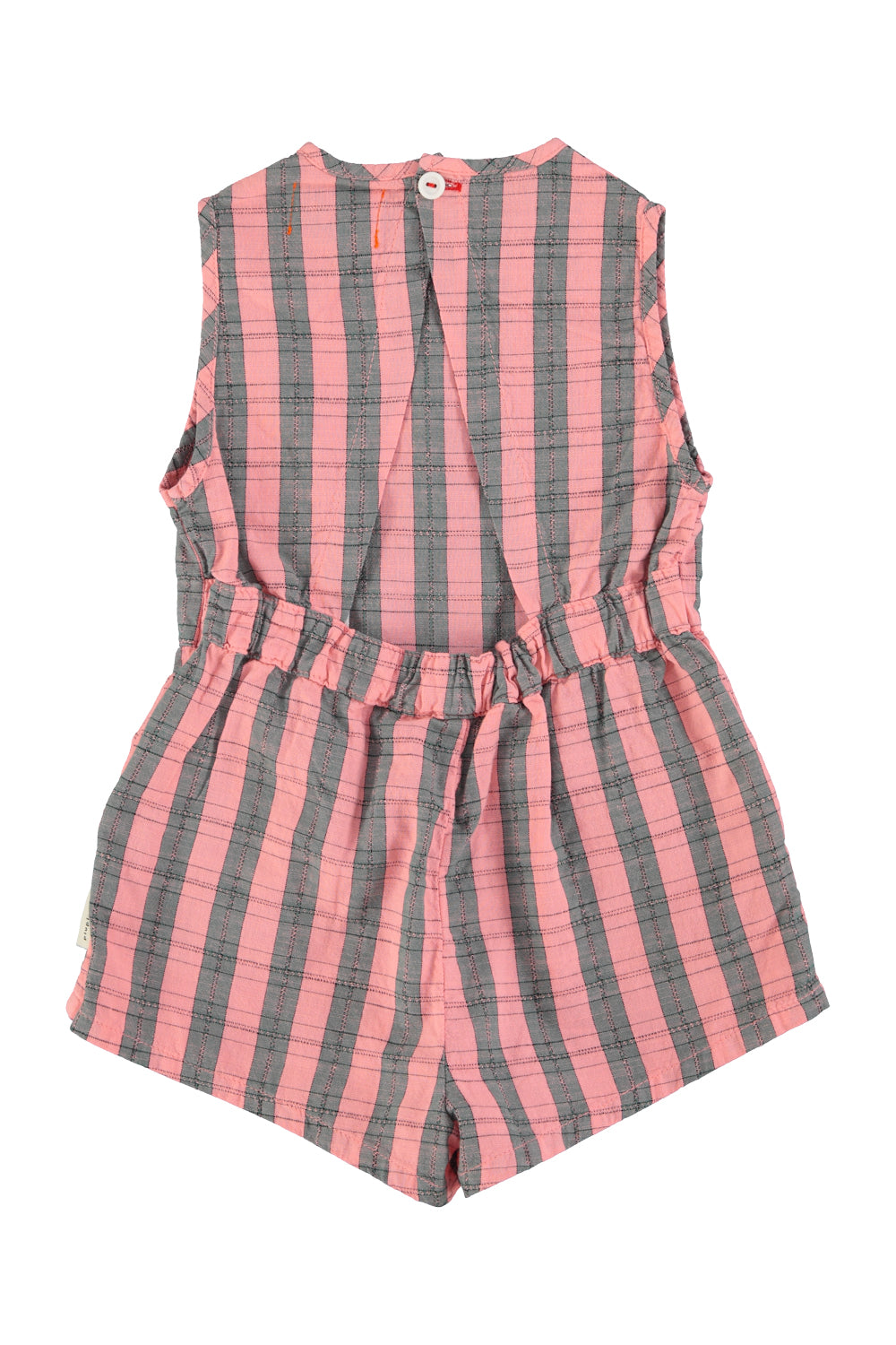 Short sleeveless jumpsuit in textured woven organic cotton with round neckline and elasticated waist for flowy and pleated fit. Detailed with a inverted v-back opening. Lateral pockets.